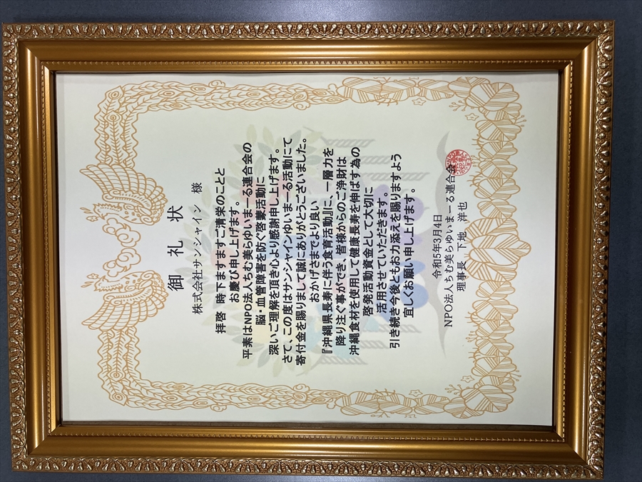 一般社団法人沖縄命(ぬち)の電話様より御礼状を拝受いたしました。