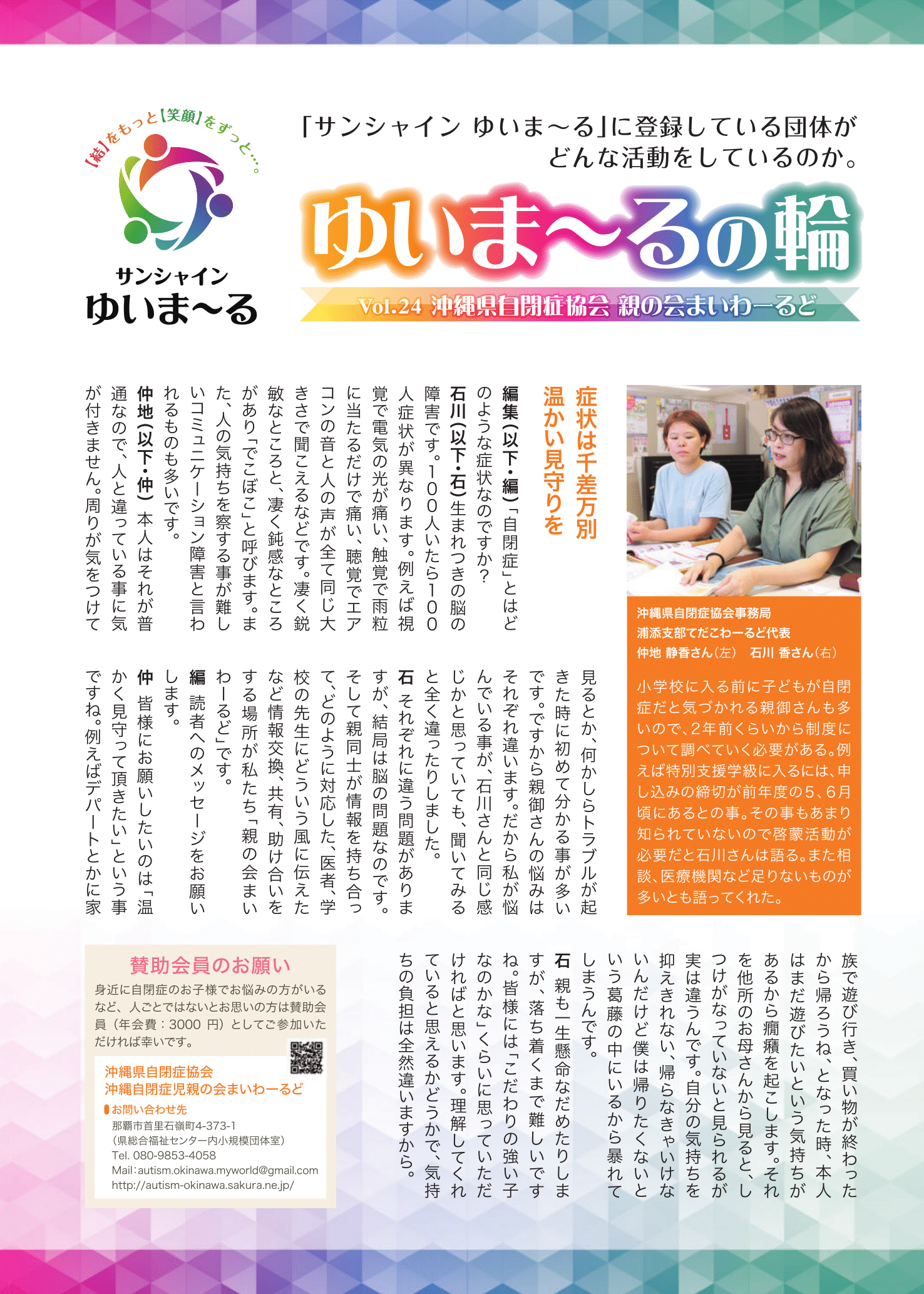 | 7 | ①保健・医療・福祉をささえる団体 | 沖縄県自閉症協会 沖縄自閉症児親の会まいわーるど | 確認 |