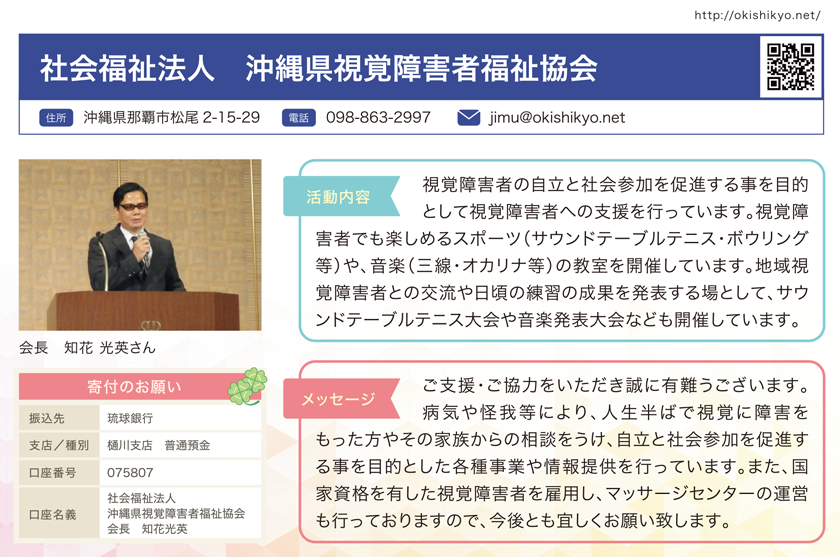 社会福祉法人 沖縄県視覚障害者福祉協会様より御礼状を拝受いたしました。