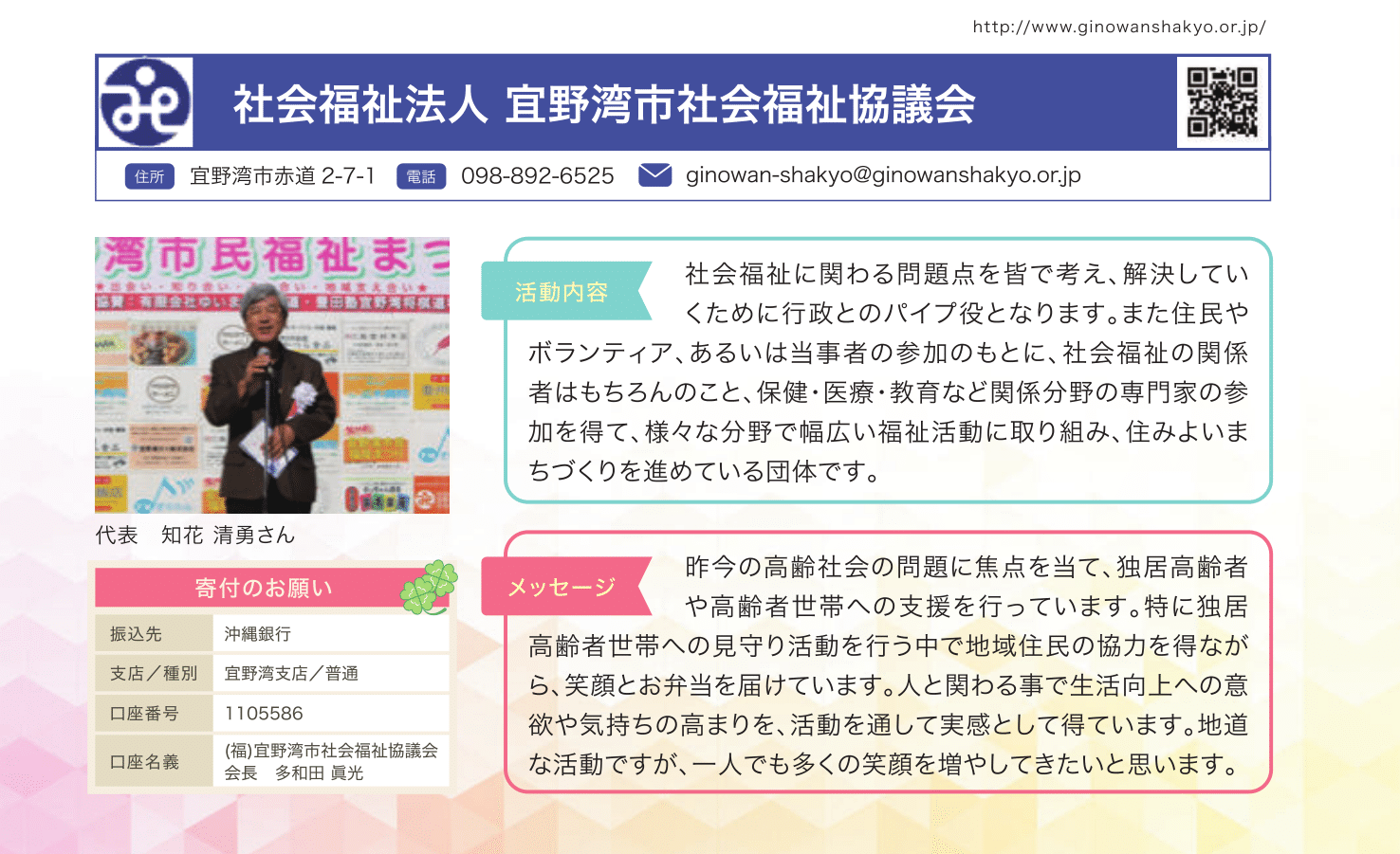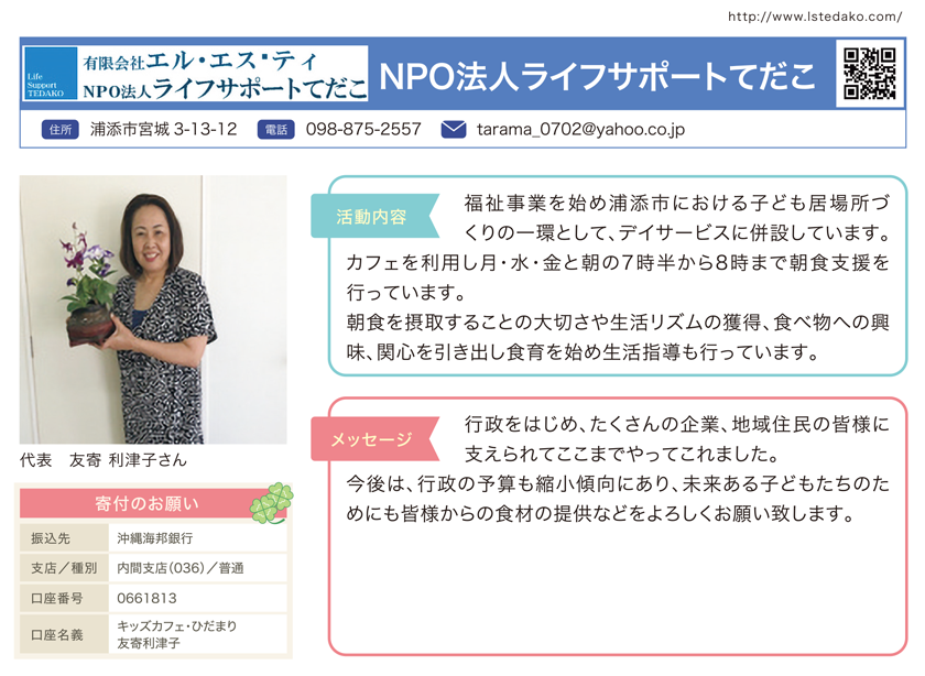 | 3 | ①保健・医療・福祉をささえる団体 | NPO法人 フードバンクセカンドハーベスト沖縄 | 確認 |
