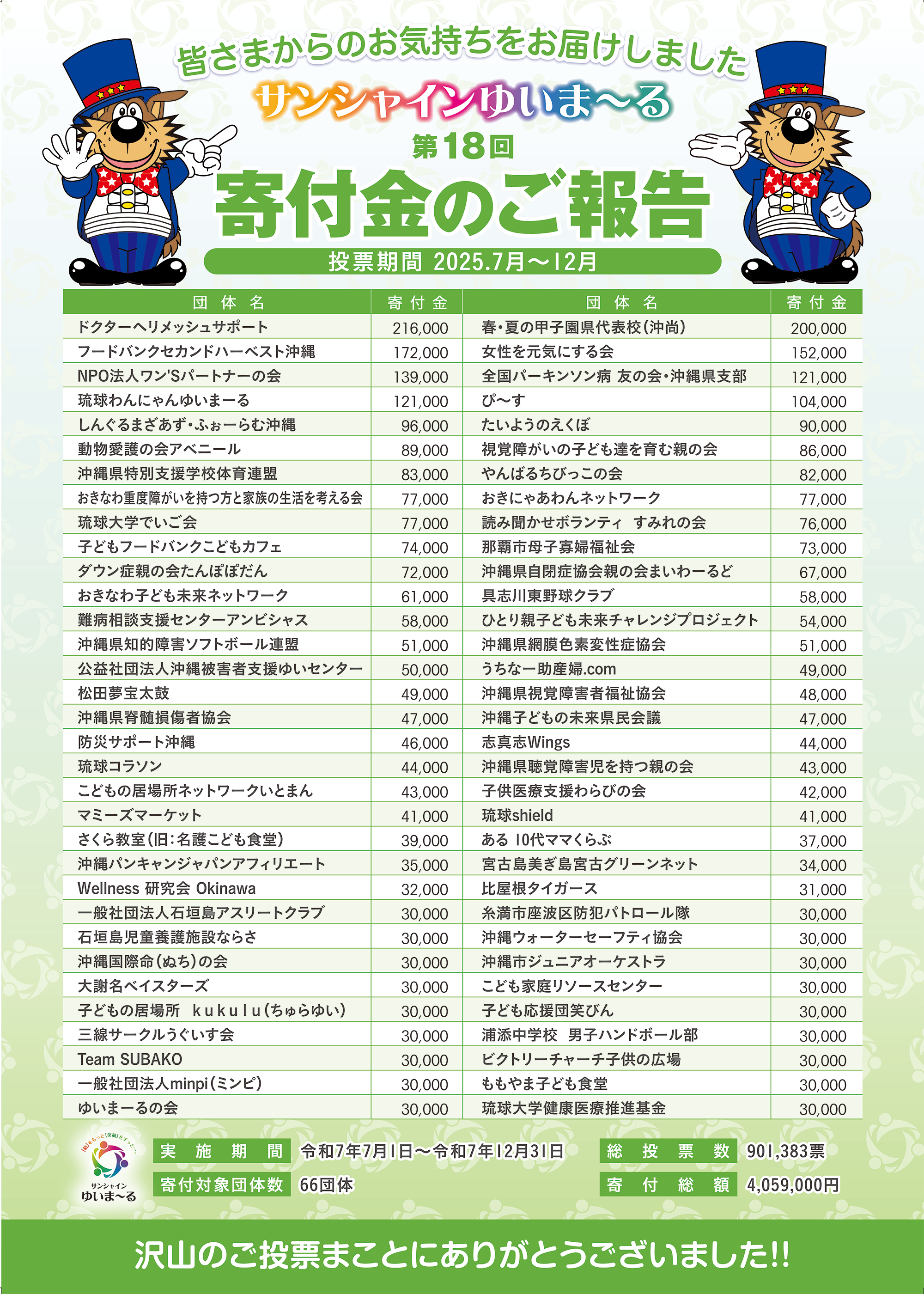 | 2025年7-12月 | 66団体 | 90万1383票 | 405万9千円 | 8020万円 |